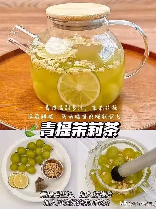 做法:青提壓出汁+檸檬片+倒入泡好的茉莉茶。