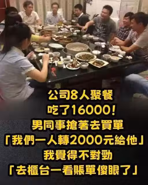 公司8人聚餐吃了16000! 男同事搶著去買單「我們一人轉2000元給他...」,我覺得不對勁「去櫃檯一看帳單傻眼了.」