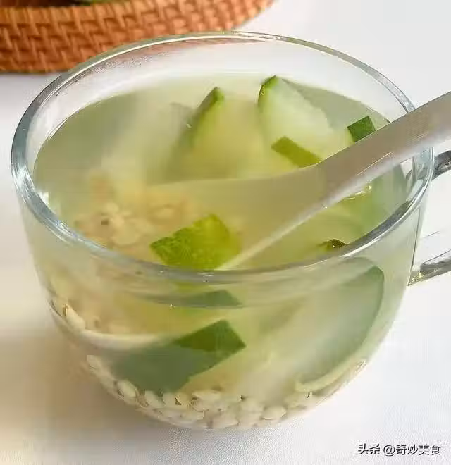 正當我對著鏡子唉聲嘆氣時,媽媽端著一碗淡綠色的水走進來,神秘兮兮地說:「快把這個喝了,保證你下午就能恢復。」我半信半疑地嘗了一口,味道清淡,帶著點薏米的清香和冬瓜的清甜。