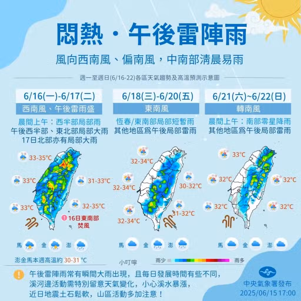 到了明 (18) 日隨著太平洋高壓增強,天氣很快又會轉好,各地大多為多雲到晴,僅午後西半部鄰近山區的平地及宜、花山區偶有局部短暫雷陣雨。周三 (18) 到周五 (21) 雖然仍會有些降雨,但範圍和強度都小,未來10天大致都為多雲到晴、高溫炎熱,午後有局部短暫雷陣雨的天氣型態。