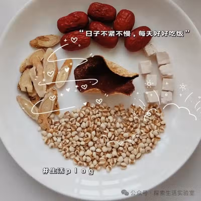 1️⃣薏米提前用小火炒至微黃,放涼備用;茯苓掰小塊,陳皮泡軟;