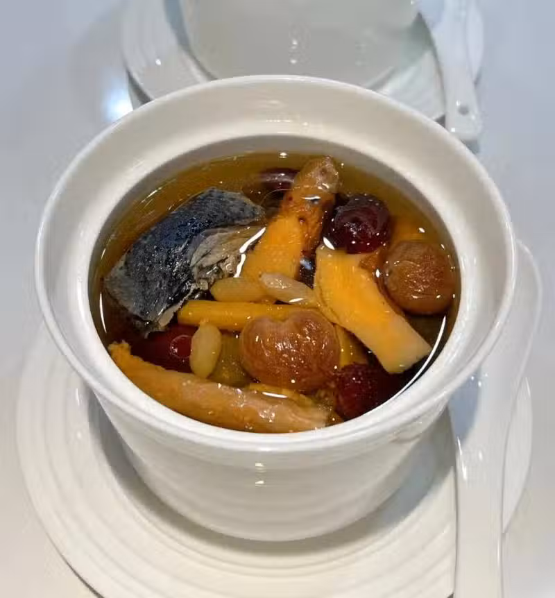 烏雞半隻、去核紅棗4個、桂圓6個、黃芪10克、麥冬2克、黨參2克、生薑3片、山藥4片、阿膠粉6克;