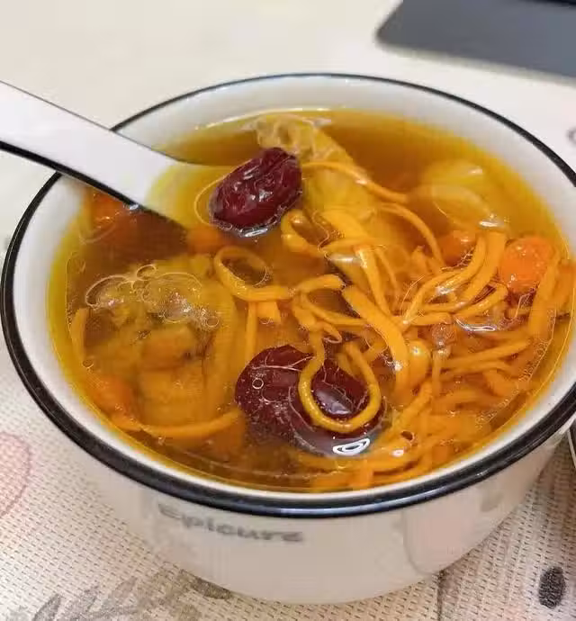 烏雞半隻、紅棗8個、枸杞15克、山藥15克、蟲草花10克、姜3片;