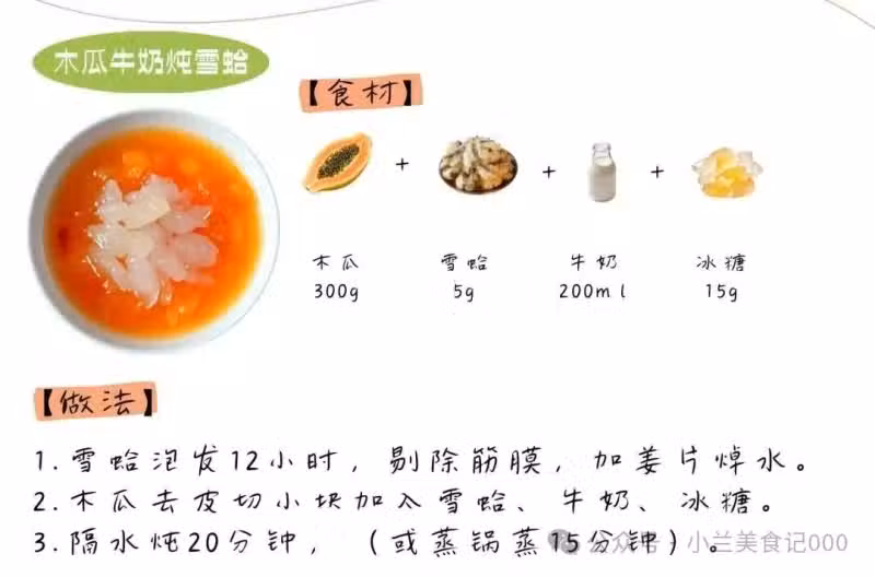 木瓜300g、雪哈5g、冰糖15g、牛奶200m l