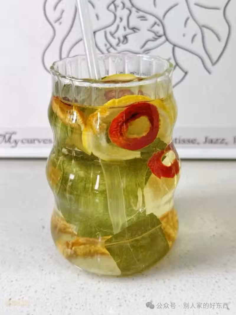 荷葉清心火,白菊降肝火,陳皮理脾氣。配上山楂檸檬,這一壺茶把夏天的內熱都能清掉。檸檬維C豐富,但要最後加,溫度太高會破壞營養。