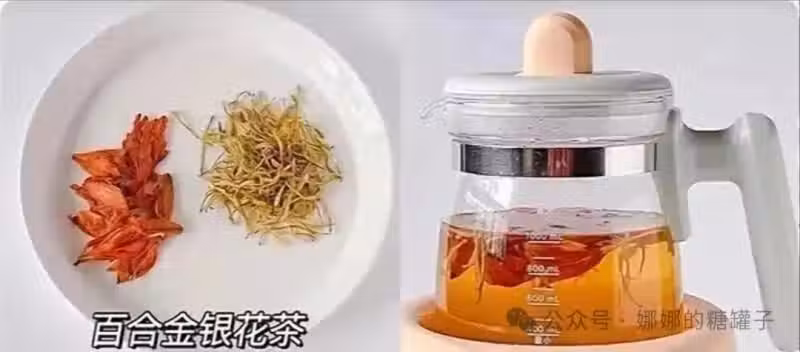 百合潤肺止咳、清心安神,金銀花清熱解毒。工作壓力大,容易上火、失眠時,喝一杯百合金銀花茶,能幫助你清熱降火,舒緩情緒,讓身心得到放鬆,晚上也能睡得更香。
