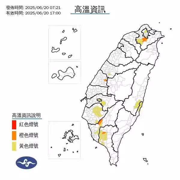 降雨部分,氣象署指出今、明 (20、21) 兩天台灣各地及澎湖、馬祖大多為多雲到晴,僅東南部地區及恆春半島有零星短暫陣雨,金門有局部短暫陣雨或雷雨;今日午後南投、嘉義以南、大台北地區及其他山區有局部短暫雷陣雨。