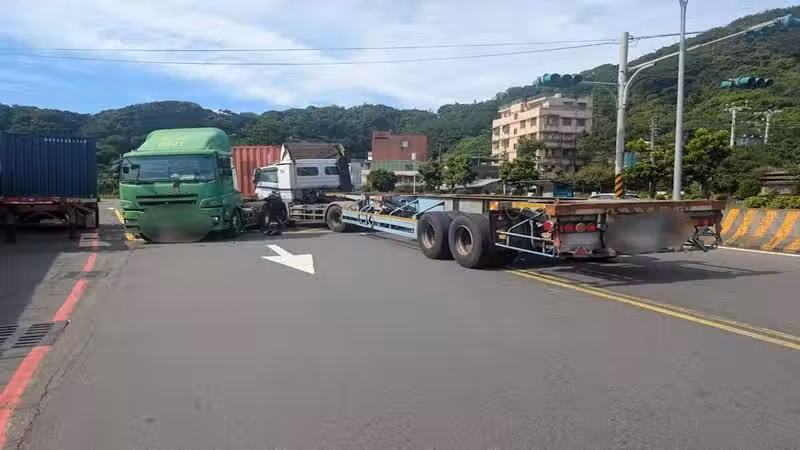 基隆市基隆港西岸22日發生貨櫃車對撞事故,1名38歲吳姓女駕駛開著白色貨櫃車正左轉,卻因不明原因與另一綠色貨櫃車發生碰撞,白車車頭撞凹導致女駕駛受困,西岸道路1度通行中斷。
