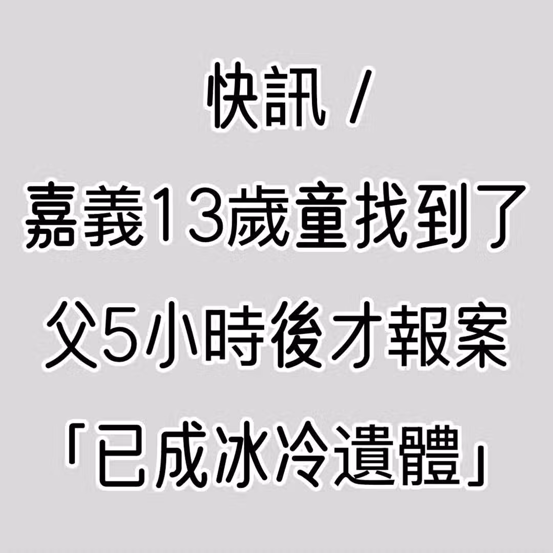 快訊/嘉義13歲童找到了!父5小時後才報案 「已成冰冷遺體」