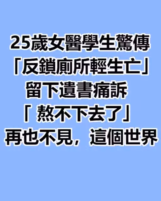 25歲女醫學生驚傳「反鎖廁所輕生亡」 留下遺書痛訴「熬不下去了」:再也不見,這個世界
