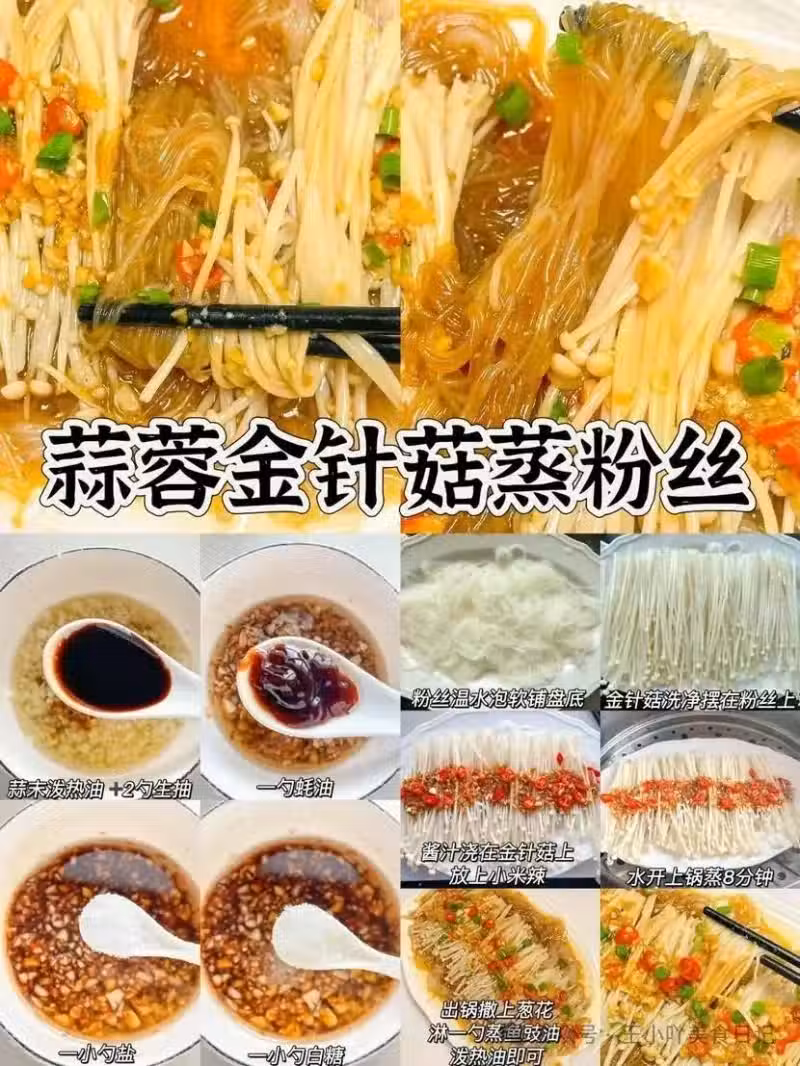 食材:金針菇200克、粉絲1把、蒜末2勺、小米辣1個、生抽2勺、蚝油1勺、鹽半勺、白糖半勺、蔥花適量、蒸魚豉油1勺