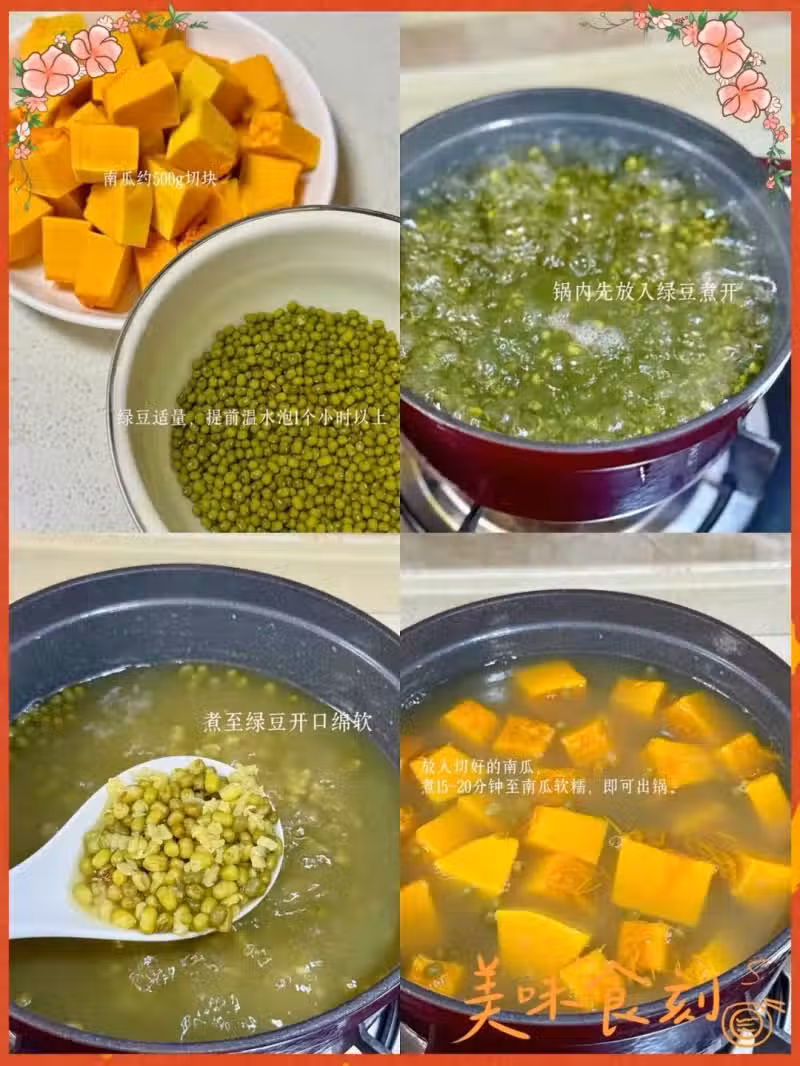 4. 把綠豆煮到裂開,南瓜塊加進去繼續煮15分鐘。