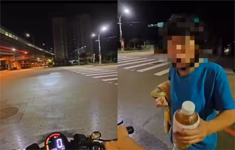 原PO在24日凌晨發文表示:「論凌晨四點路人要我幫她開瓶蓋的機率」,從影片中可見,原PO騎機車在待轉區等紅燈時,一開始環顧四周都沒有人,