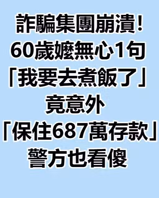 詐騙集團崩潰!60歲嬤無心1句「我要去煮飯了」 竟意外「保住687萬存款」警方也看傻