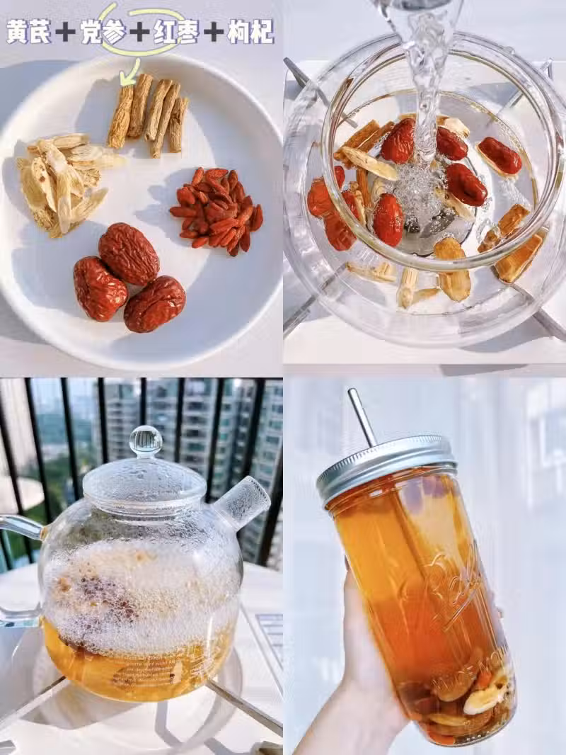1. 紅棗(去核防上火)、黨參、黃芪稍沖洗,放入壺中,加適量水。大火煮沸後轉小火,慢煮30分鐘。
