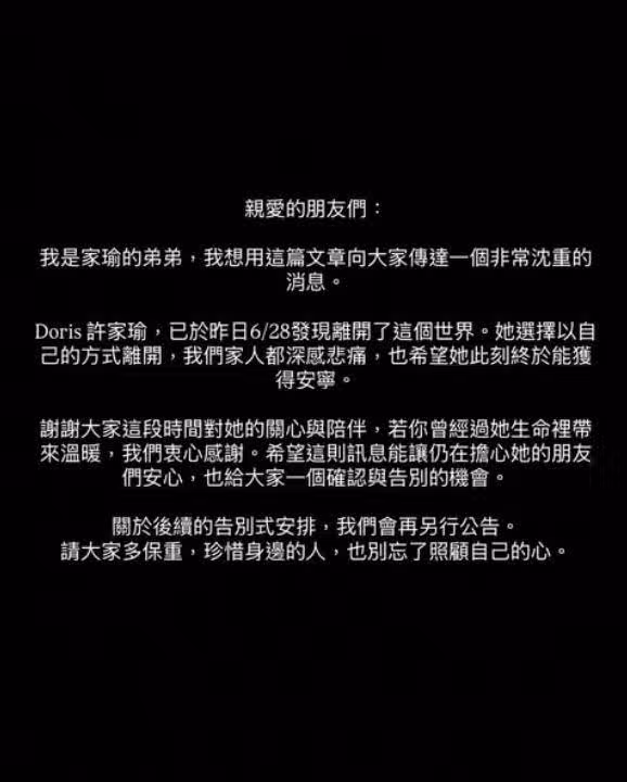 我們家人都深感悲痛,也希望她此刻終於能獲得安寧。謝謝大家這段時間對她的關心與陪伴,若你曾經過她生命裡帶來溫暖,我們衷心感謝。希望這則訊息能讓仍在擔心她的朋友們安心,也給大家一個確認與告別的機會。關於後續的告別式安排,我們會再另行公告。