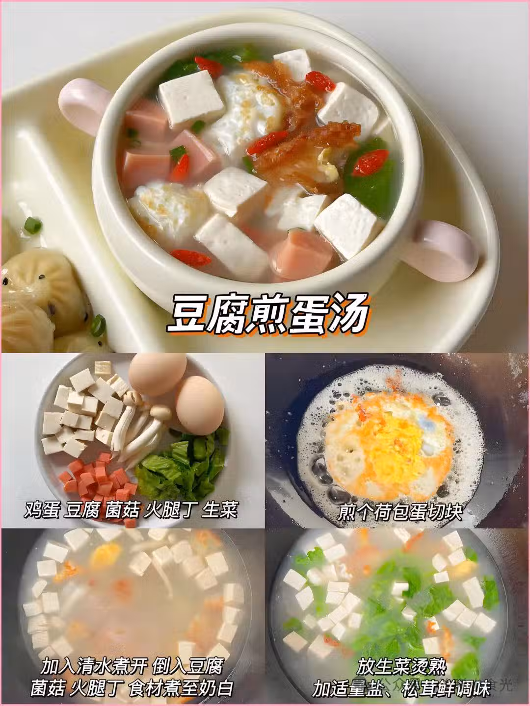 1. 豆腐切塊,雞蛋煎成荷包蛋後切塊,菌菇、火腿丁備好,生菜洗凈。