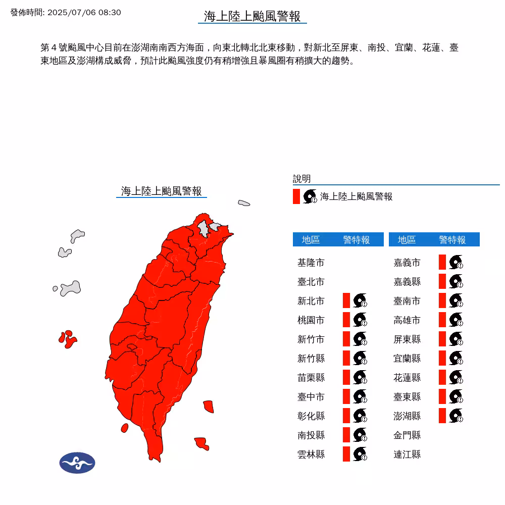 氣象署表示,颱風及其外圍環流影響,易有短延時強降雨,今天台東縣及恆春半島有局部豪雨或大豪雨;上午起屏東縣地區及高雄市山區有局部豪雨或大豪雨,花蓮縣、雲林縣、嘉義縣市、台南市、高雄市地區及南投縣山區有局部大雨或豪雨發生,宜蘭、澎湖、金門地區及蘭嶼、綠島有局部大雨發生的機率;晚起苗栗至彰化、南投地區及新竹以北山區易有局部大雨發生的機率。