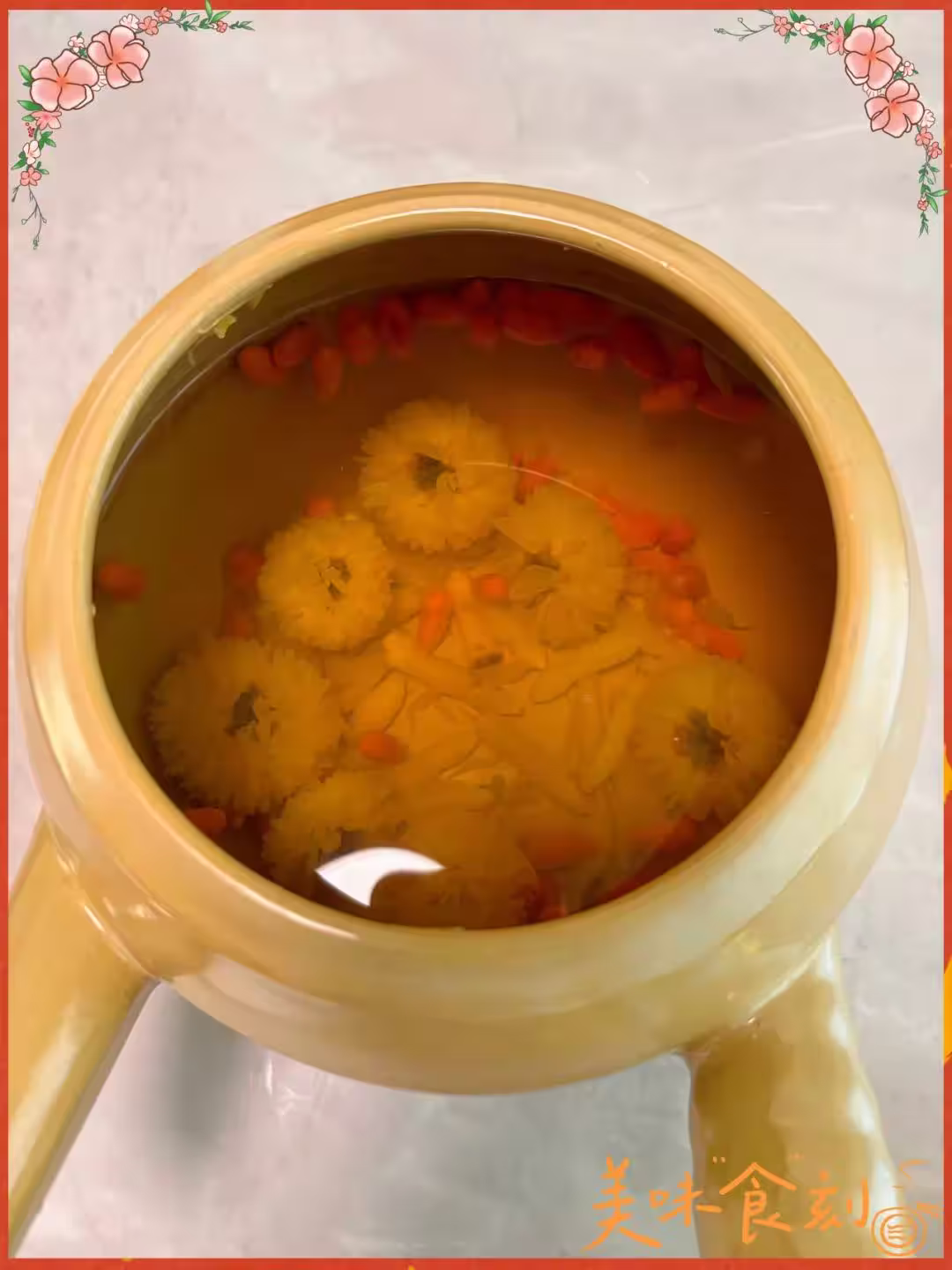 麥冬菊花水用麥冬和菊花一起煮水,煮開一會關火再下一小把枸杞,三伏天如果感覺到熱氣的朋友可以喝起來。
