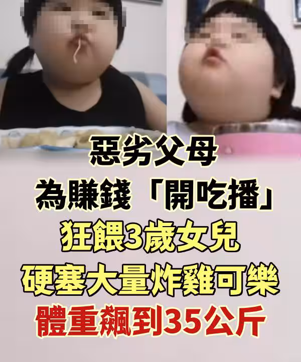 惡劣父母為賺錢「開吃播」狂餵3歲女兒 硬塞大量炸雞、可樂:體重飆到35公斤!