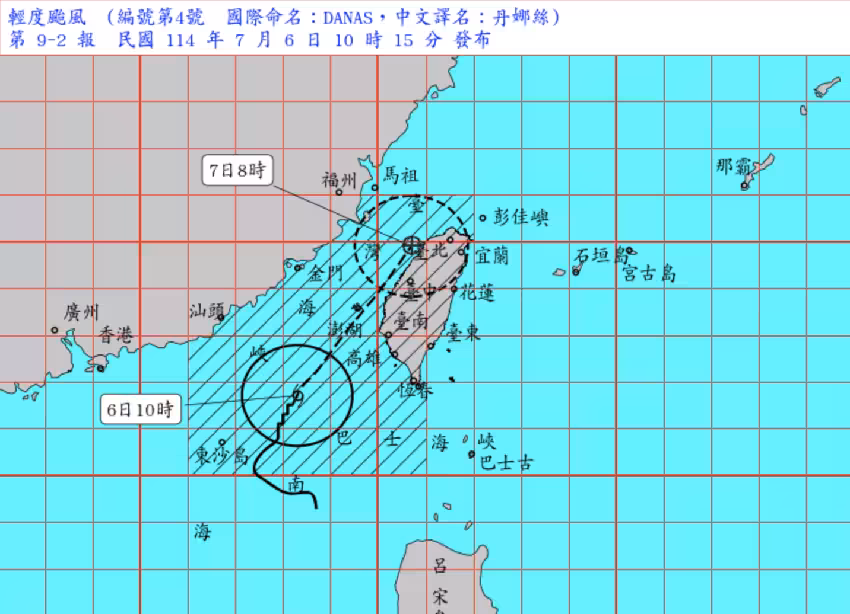 丹娜絲逐漸逼近台灣,今天至明天上午影響最明顯,暴風圈最快今天下午至傍晚接觸澎湖或本島西南方陸地!