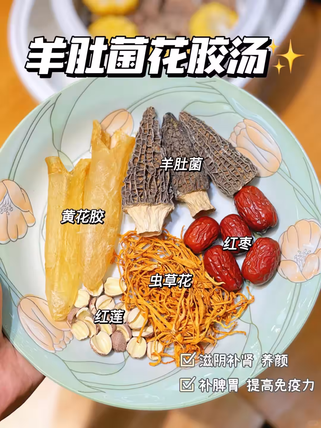 食材:羊肚菌,黃花膠,紅棗,紅蓮,蟲草花、排骨