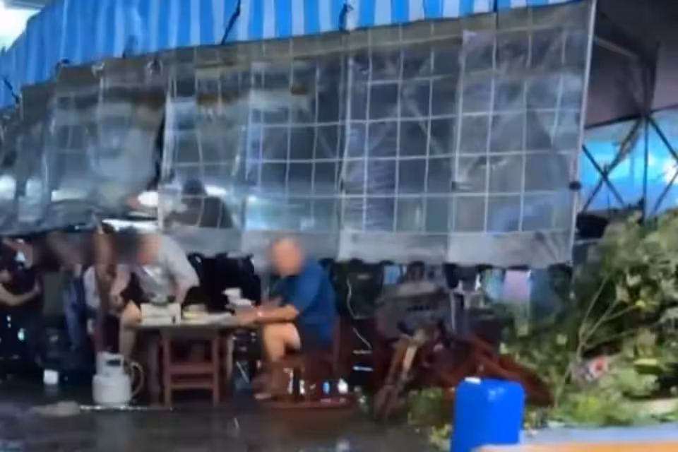 丹娜絲颱風威力驚人,昨(6)日上午已從輕台轉為中台,其少了中央山脈的阻擋,台灣西部雨勢大、風速驚人,台南氣象觀測站更在晚間測得13級強陣風,直衝該站站史第3名;然而有民眾至台南一家小吃店用餐,店家棚架疑似承受不住風力倒塌,棚子快被吹走,還擊中一名阿伯肩膀,不過阿伯不受其影響,淡定享用手中餐點,也讓網友好奇「到底哪家小吃這麼好吃」