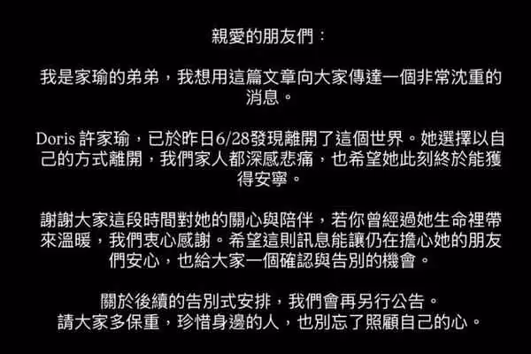 Doris的弟弟透過她的IG帳號發出黑底白字貼文向外界告知死訊,「我是家瑜的弟弟,我想用這篇文章向大家傳達一個非常沉重的消息。Doris 許家瑜,已於昨日6/28發現離開了這個世界。」