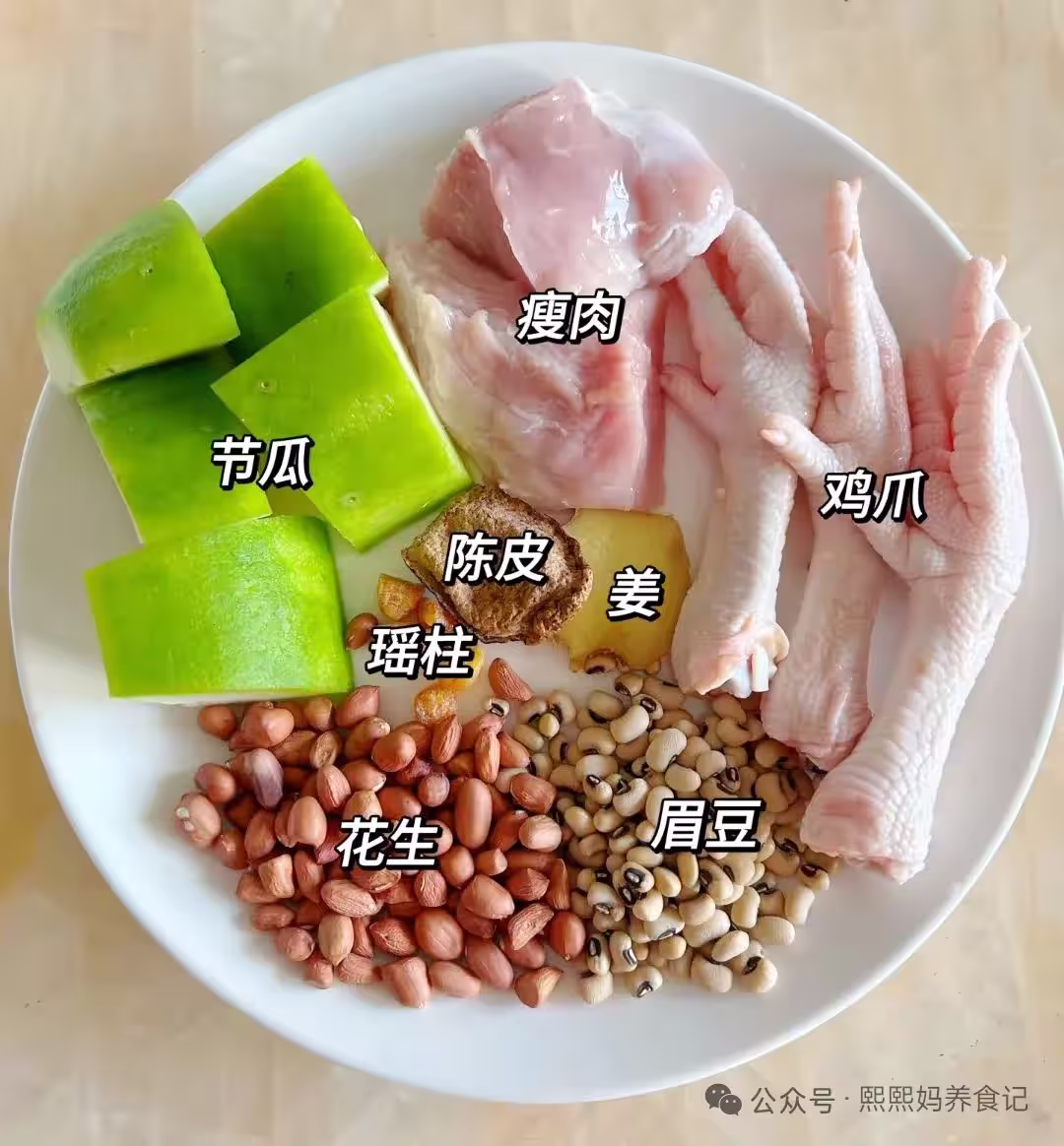 瘦肉250克、雞腳6隻、節瓜1根、花生50克、眉豆50克、陳皮1片、瑤柱5顆、生薑3片