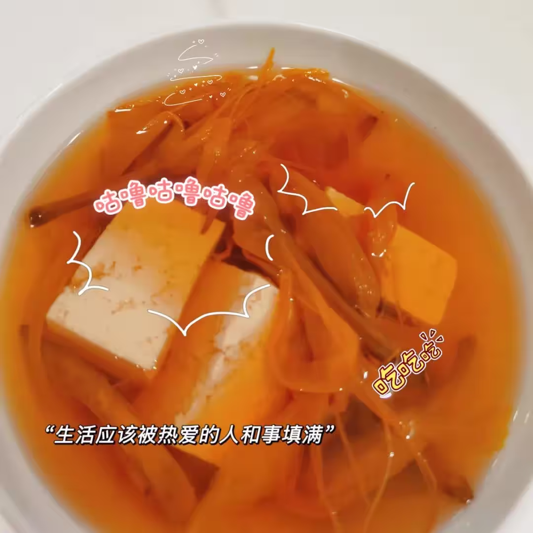 黃花菜又叫「忘憂草」,上次項目忙到焦慮失眠,同事給我推薦這湯。喝完後心裡沒那麼煩躁了,黃花菜吸飽了湯汁,豆腐嫩滑爽口,湯很清淡,適合夏天喝,就是黃花菜一定要泡透,不然會有澀味。豆腐清熱,晚上躺床上腦子不會反覆想工作的事,能慢慢靜下來。