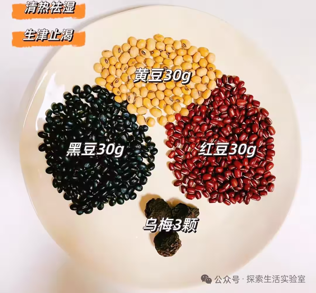 紅豆30克、黑豆30克、黃豆30克,烏梅3顆,冰糖適量