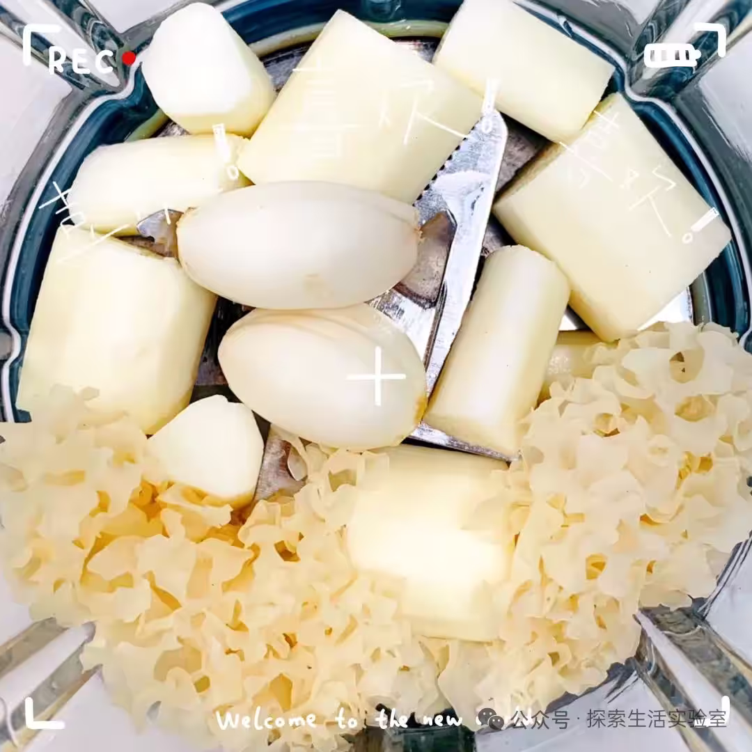 1️⃣銀耳用溫水泡發,至少泡2個小時,然後去掉根部黃色硬塊,撕成小朵;山藥削皮(一定要戴上橡膠手套,不然手會癢得難受),切成滾刀塊;干百合用清水泡15分鐘。
