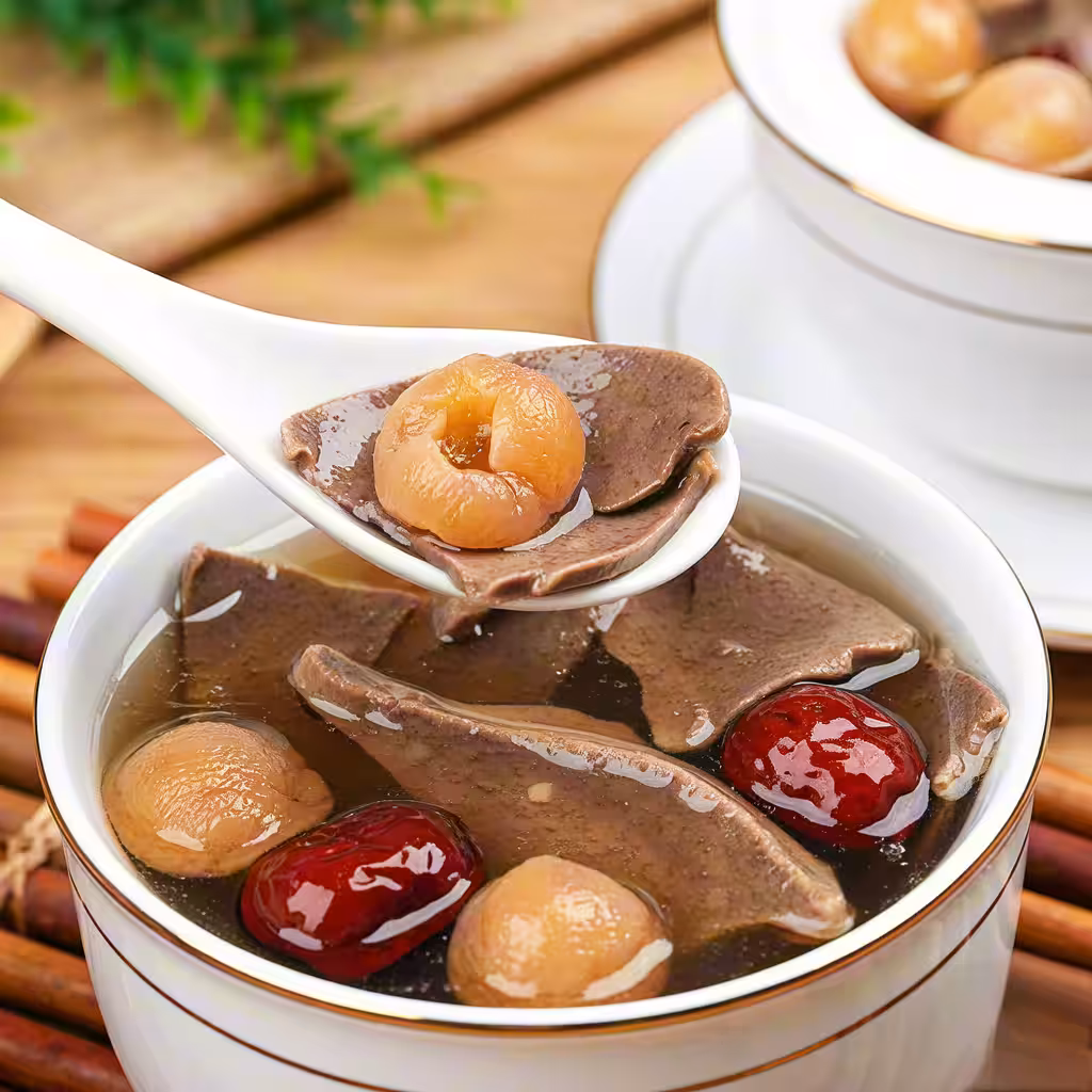 【功效】桂圓補益心脾,紅棗健脾養血,豬肝富含鐵元素,適合面色蒼白、頭暈乏力、用眼過度人群。