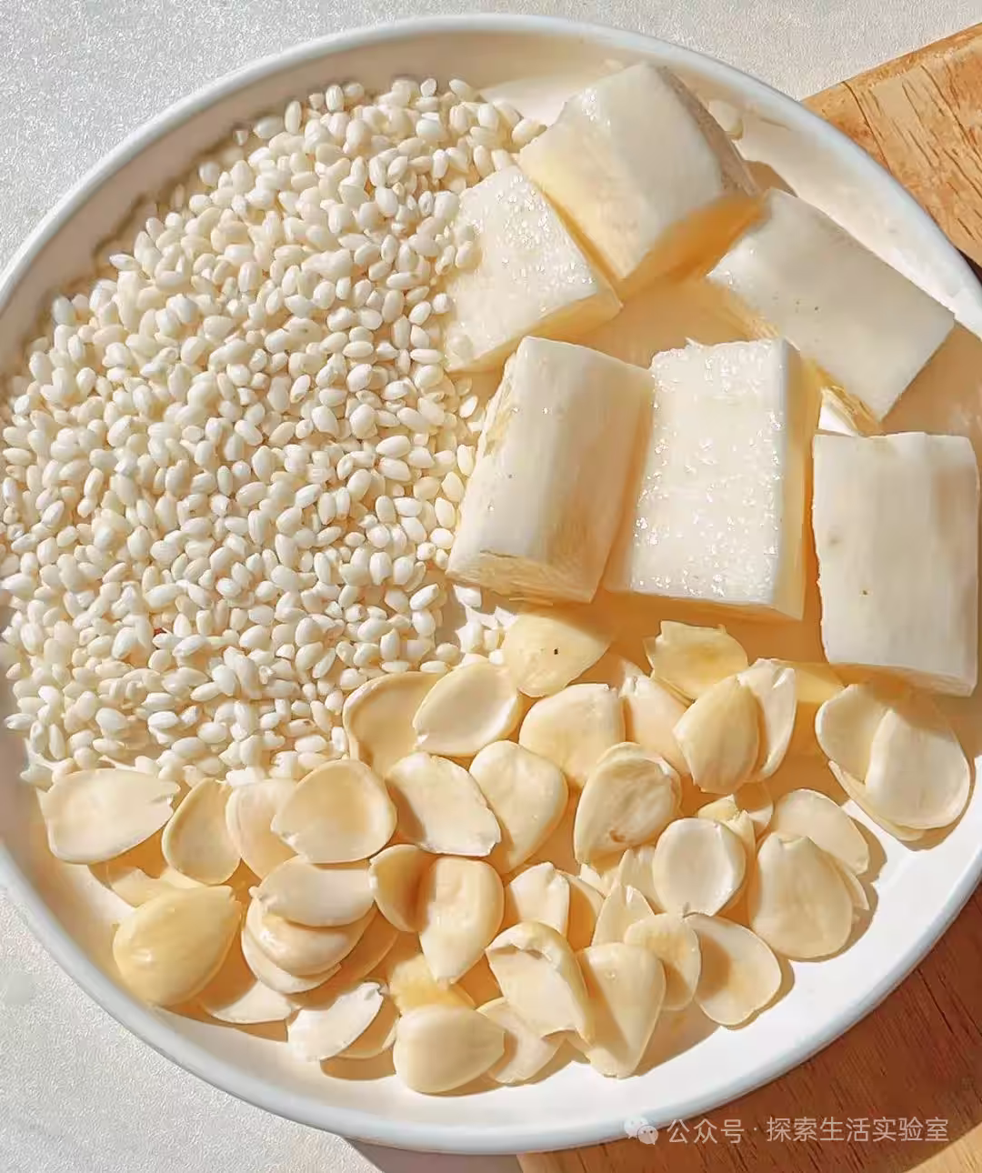 1️⃣山藥切小塊,南杏仁、糯米洗乾淨,一起泡30分鐘。