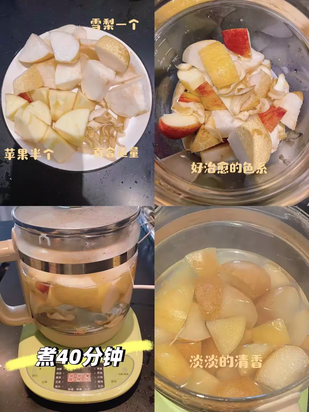 1. 蘋果、雪梨洗凈,去皮去核,切成小塊,百合干沖洗乾淨,所有食材放入養生壺,加足量清水,煮40分鐘左右。