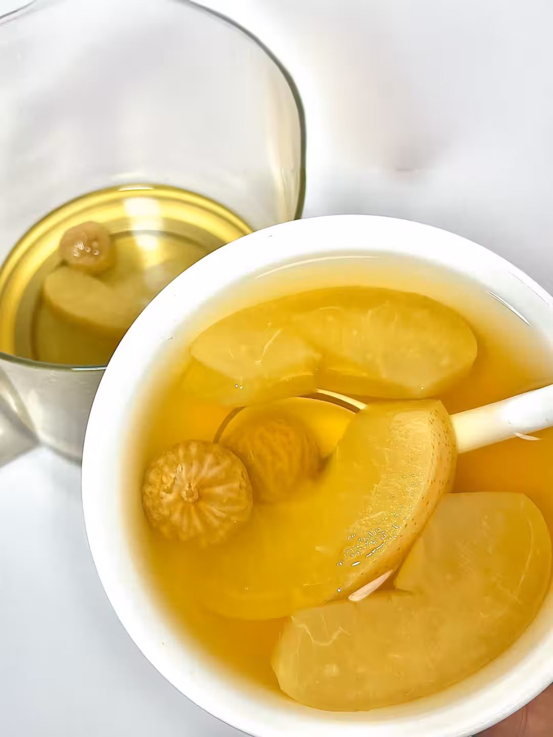 無花果有「生命之果」的美譽,能清熱潤腸。煮熟後的蘋果也更容易消化吸收。兩樣一起搭配煮水,味道清甜可口。