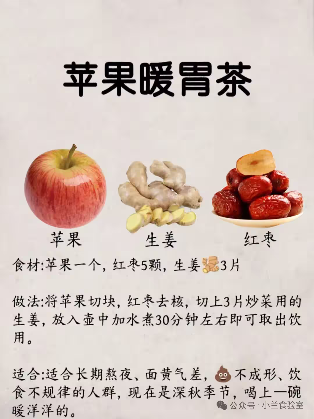 2:食材入壺加600ml水,煮30分鐘,熱飲效果更佳。功效:生薑散寒暖胃,紅棗補血,蘋果調和,