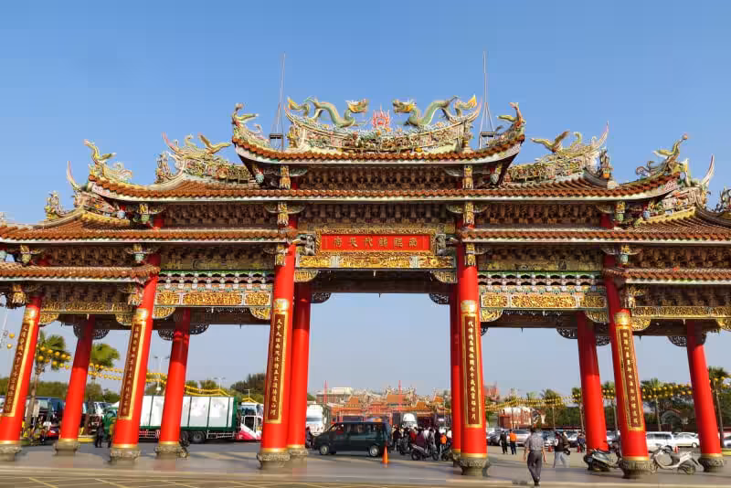 這座具有40年歷史的牌樓,是以12根直徑81公分、高達14米的珍貴千年紅檜所建造,採用傳統純榫接工法,不用一根釘子就完成這座地方信仰重要地標。