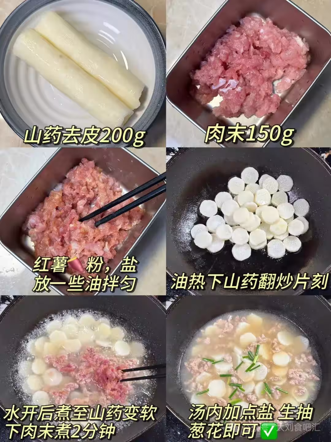 食 材 山藥 200g(去皮)、肉末 150g、紅薯粉、鹽、油、生抽、蔥花 做 法 1. 山藥去皮切薄片;肉末加紅薯粉、鹽、少許油,攪拌均勻腌制 。 2. 鍋中倒油,油熱放入山藥片翻炒片刻 。 3. 加水煮開,煮到山藥變軟,放入腌制好的肉末,煮 2 分鐘 。 4. 加適量鹽、生抽調味,撒蔥花即可出鍋 。