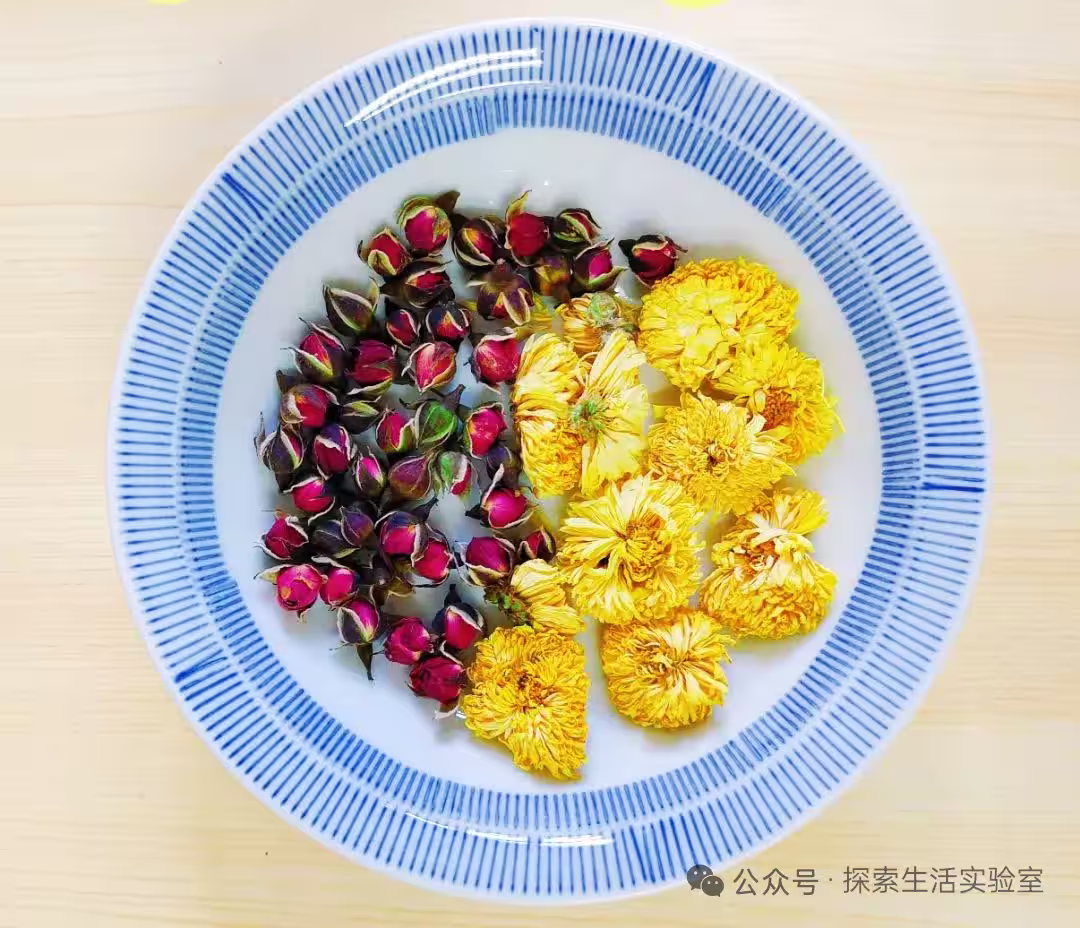 1️⃣玫瑰和菊花用溫水快速沖一下(別泡太久,香味會跑)
