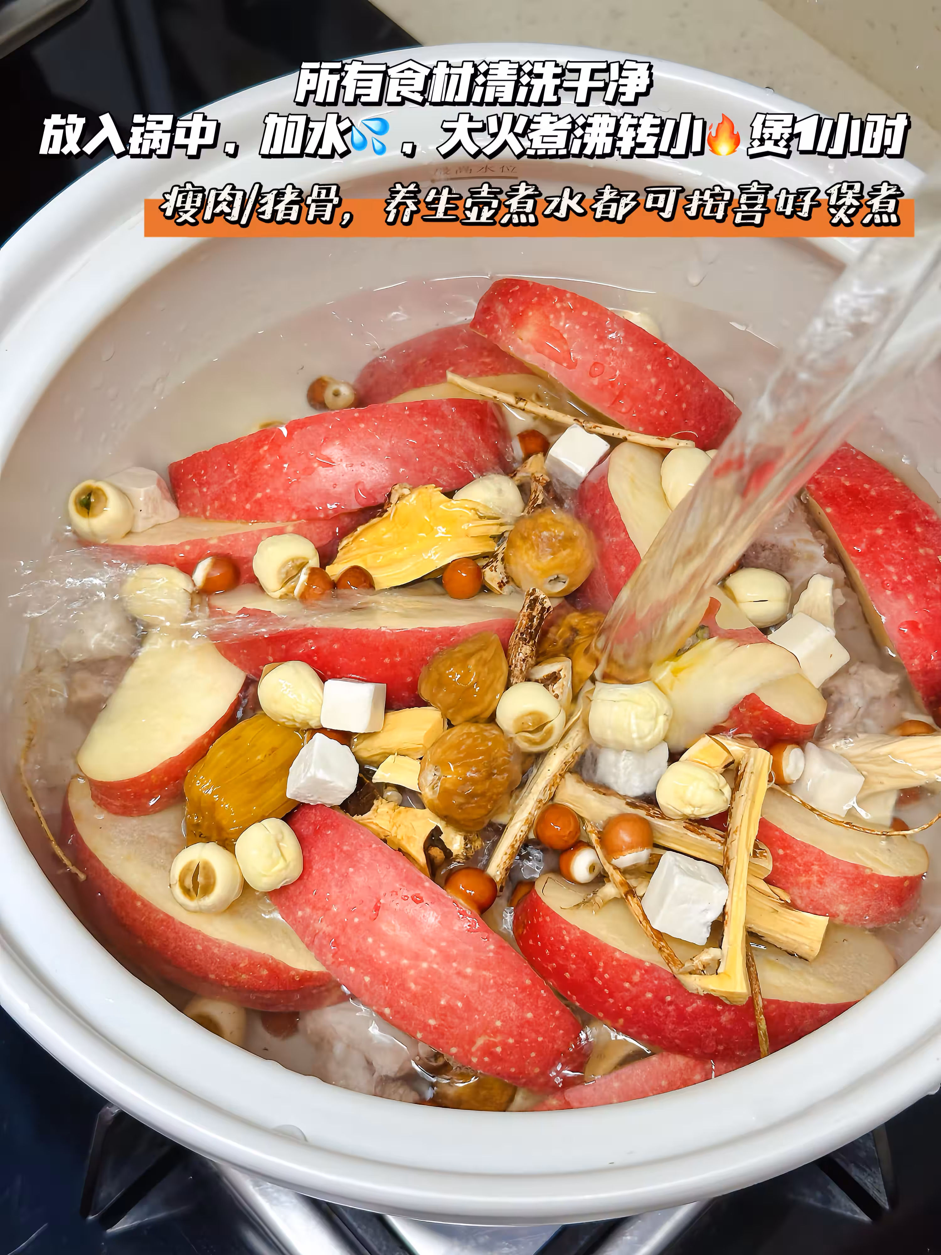 瘦肉焯水,蘋果用鹽洗凈表皮,去芯切塊,湯料沖洗乾淨,所有食材清洗後放入湯鍋里,加適量水,大火煮開轉小火1小時,