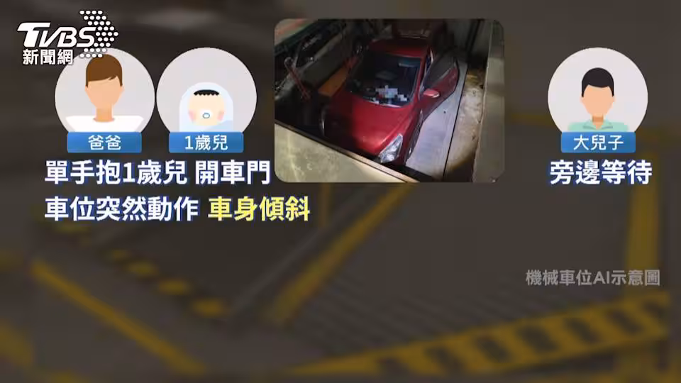 台中有一歲小男童命喪機械停車位。前天晚間(7/19)男童的爸爸獨自帶兩個兒子要外出用餐,他讓大兒子在機械車位旁等待,抱著小兒子打開車門,準備上車,機械車位卻突然動了,兩人摔進下方坑洞,車位下降,壓到一歲男童,送醫搶救後,醫師宣告不治。