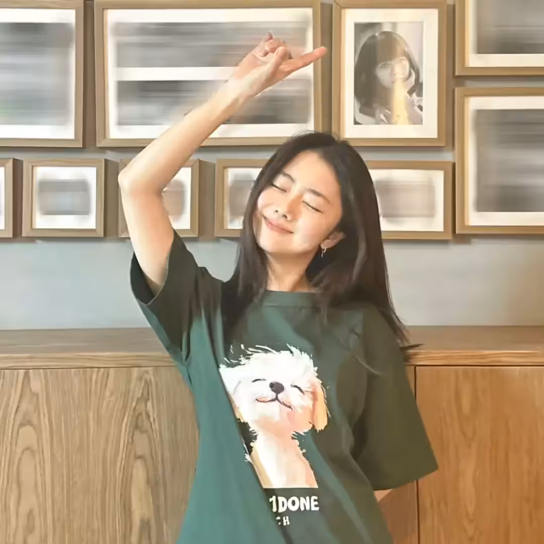 照片中,她身穿墨綠色T恤,上面印著可愛的狗狗圖案,一頭黑色長髮自然垂落,對著鏡頭開懷大笑。由內而外散發的青春氣息,很難相信她今年已經35歲了。