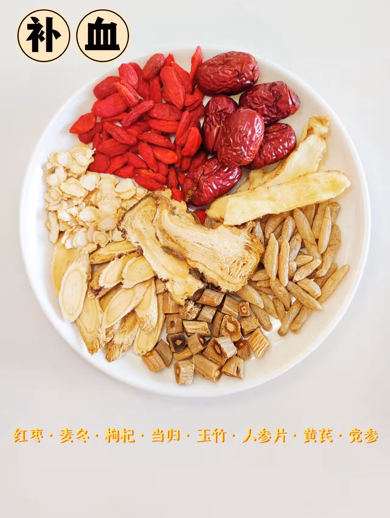 搭配紅棗、麥冬、枸杞、當歸、玉竹、人參片、黃芪、黨參調理