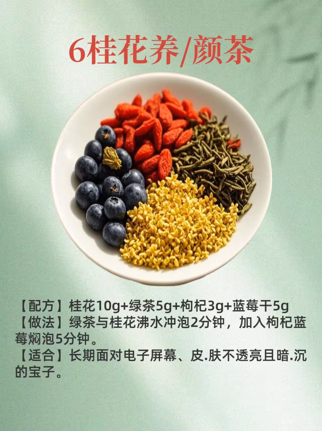 🍇桂花養/顏茶:長期面對電子螢幕、皮膚/暗/沉的寶子,試試這款茶。桂花、綠茶沸水沖泡2分鐘,枸杞、藍莓干燜泡,喝完皮膚.亮亮,氣/色都好了~