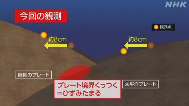 研究團隊直言,海側的板塊每年大約以8公分的速度朝向陸地移動,而設置在陸側板塊、靠近海溝軸的觀測點也同樣每年移動約8公分,代表海側板塊正向下沉入陸側板塊之下,兩者之間緊密黏合,導致能量不斷累積。