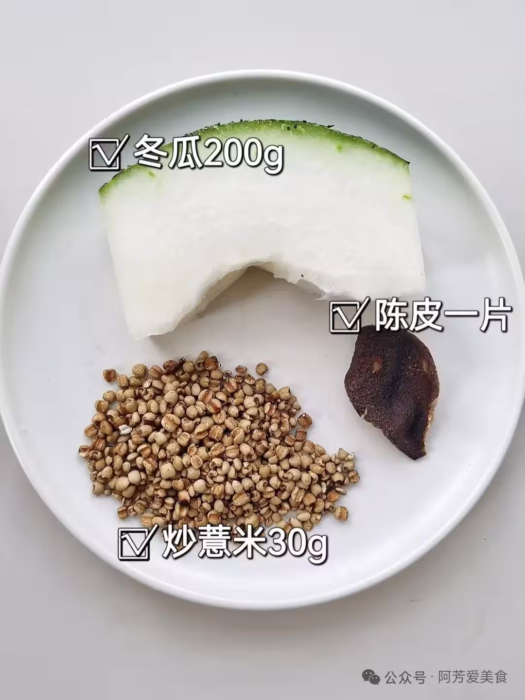 備好冬瓜200克,削掉硬皮切厚塊。一片陳皮提前浸軟,用小刀輕輕颳去內里白色的瓤,這樣湯才清潤不澀口。最後抓一小把炒米,大約30克就夠。