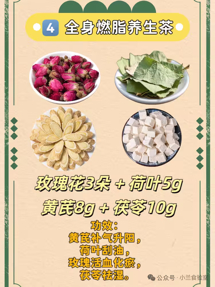 功效:黃芪補氣昇陽,荷葉刮油,玫瑰活血化瘀,茯苓祛濕。一個月掉秤8斤,全身脂肪都在「燃燒」!