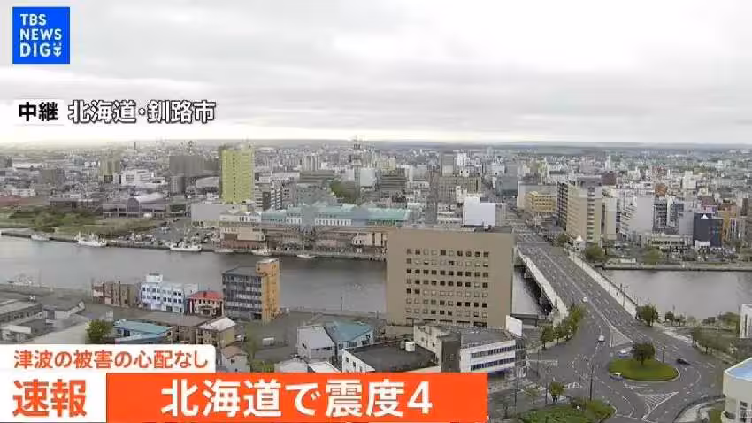 北海道釧路市等地最大震度4、北海道帶廣市、根室市、青森縣八戶市等地最大震度3。
