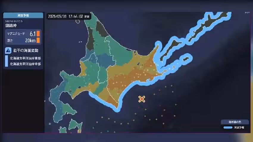 日本氣象廳於下午5點43分也發布海嘯預報,稱北海道太平洋沿岸東部、北海道太平洋沿岸中部,在接下來約2至3小時,海面會發生些許變化,但將不會釀成災情。